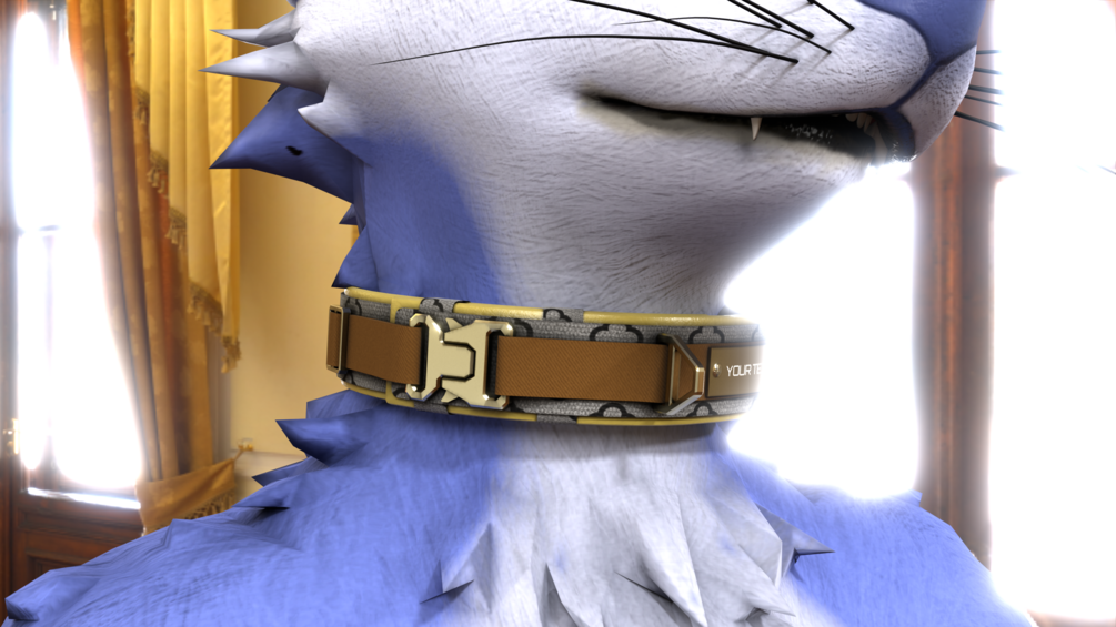 The collar comes with two skins and you can customize the name plate and the two rubber like velcro patches with the PSD File, if you don't have access to Substance Painter.