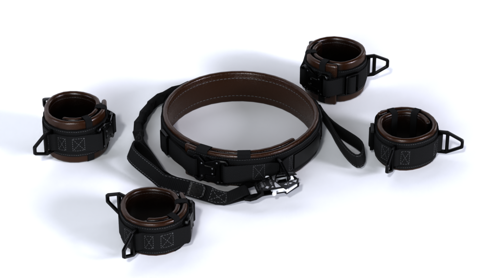 The collar and cuffs come with two skins. They also have a simple rig for the d-rings.